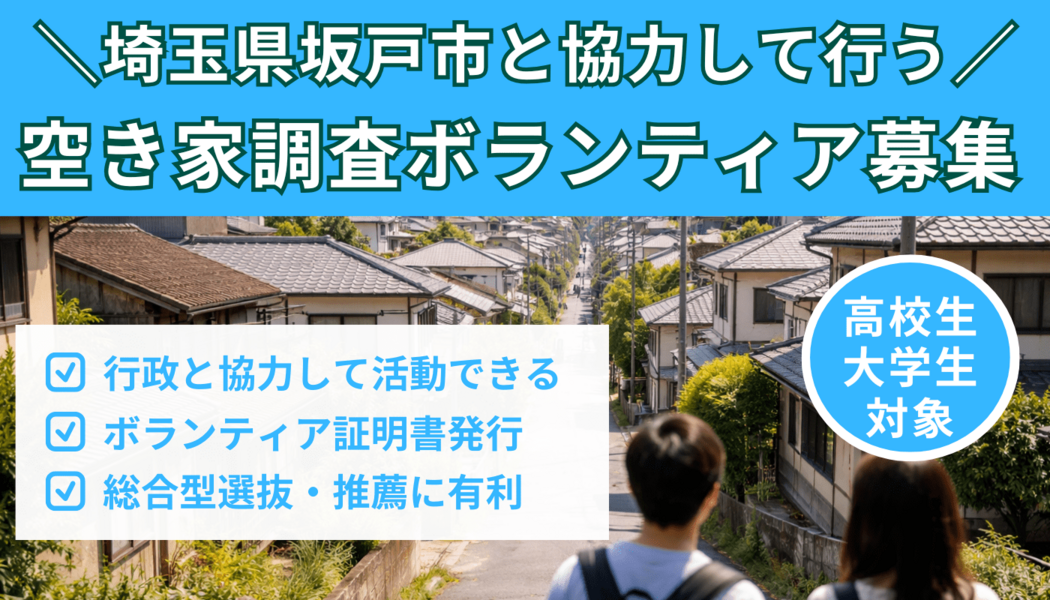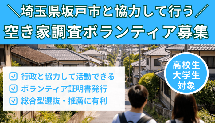 埼玉県坂戸市の協力のもと、空き家の実態を把握するための調査ボランティアを募集します。現地調査は土日や長期休み中心。ボランティア証明書発行・保険加入あり。