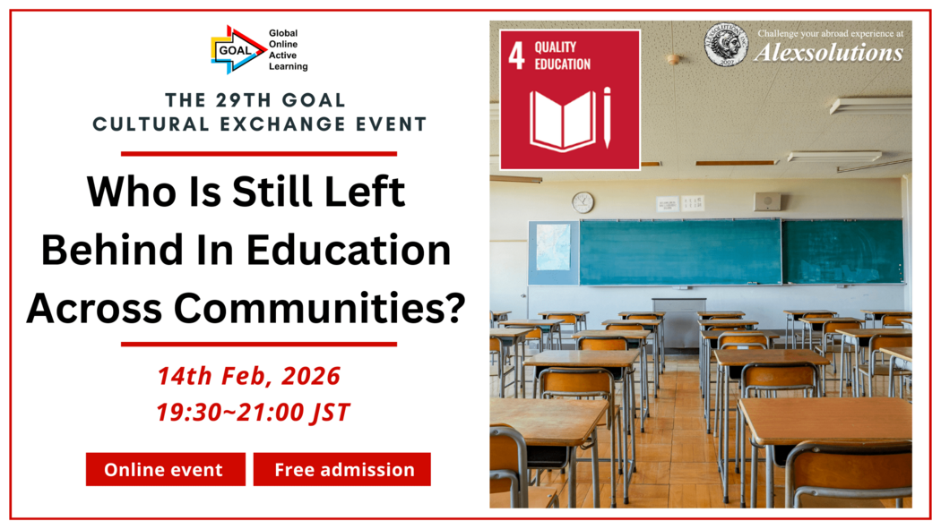 この国際交流イベントは、アレックスソリューションズが主催するグローバル人材育成プログラム「GOAL」の第29回発表会として行われます。