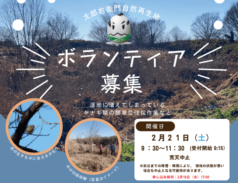 埼玉県の川島町・桶川市・上尾市にまたがる太郎右衛門自然再生地にて、湿地の保全のため、簡単な木の伐採作業などを行います。