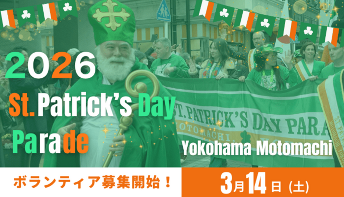 2026年3月14日に横浜元町ショッピングストリートで開催される国際色豊かなセントパトリックデーパレードを一緒に盛り上げてくれるボランティアさんを募集します。