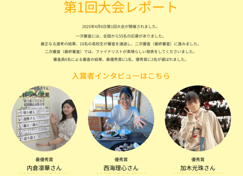 昨年は、55名の高校生が全国から集まり、書類審査を通過した10名が最終審査へと進みました。最終審査では、最優秀賞1名、優秀賞2名が選ばれました。▼昨年度入賞者のテーマ