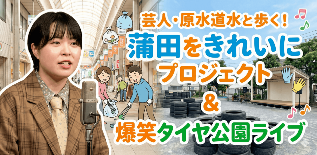 芸人・原水道水と蒲田をきれいにしよう!商店街でのガイド付きごみ拾いと、名物タイヤ公園での青空ライブを1時間に凝縮。「ごみ拾いってこんなに楽しいの!?」を体感できる、笑いとスッキリの新感覚ごみイベント!