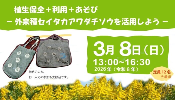 河北潟干拓地の防風林帯で、春先に地面に葉を広げる外来種セイタカアワダチソウを根ごと抜き取ります。抜き取った植物を活用し、草木染め(絞り染め)も体験します。外来種対策と自然を活かす環境保全活動です。