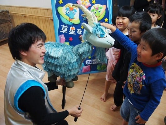 NPO法人おはなしキャラバンつばさの人形劇は、子どもを静かにさせて、一方的におはなしをするのではなく、子どもに問いかけ対話する中で、観ている誰もがおはなしの「主人公」になれる参加型の人形劇です。