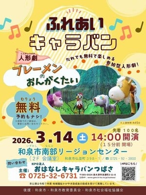 人形劇団事務所は泉大津ですが、『ふれあいキャラバン』会場・集合場所は和泉市南部リージョンセンターになります。 |