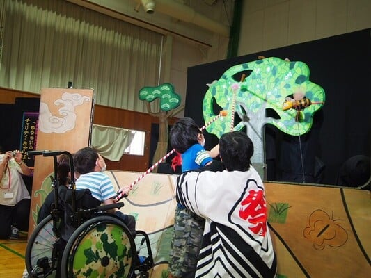 『ふれあいキャラバン』は年齢や特性に関わらず誰もが楽しめる参加型人形劇です。今回は和泉市社会福祉協議会地域福祉かがやき助成金により実施し、地域の放課後等デイサービス等の福祉施設も招待しています。