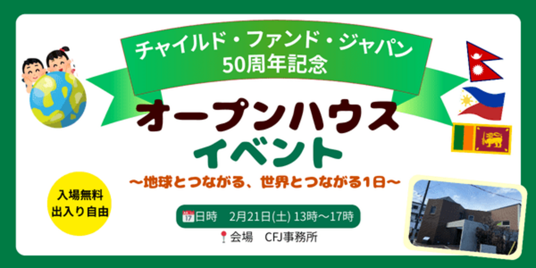 特定非営利活動法人チャイルド・ファンド・ジャパンは、アジアの貧困地域の子どもたちを支援する国際協力NGOです。今回の「オープンハウス」は、チャイルド・ファンド・ジャパンの事務所(東京都杉並区)を一般開放し、団体の活動や支援地域(フィリピン、ネパール、スリランカ)の現状などを学ぶことができる体験型のイベント。新型コロナウイルスの影響もあり、これまで開催を見合わせていましたが、この度、国際協力活動を開始して50周年を記念し、17年ぶりに開催することになりました!