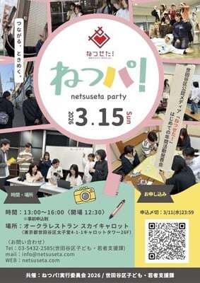 ねつせた!初めての年間活動発表会と、地域やねつせた!に興味のある学生との交流会を兼ねたパーティー(通称:ねつパ!)を開催します。イベント内にて、新メンバーに向けた説明会も実施します。活動に興味のある学生のみなさん、ゼヒお気軽に遊びにいらしてください。