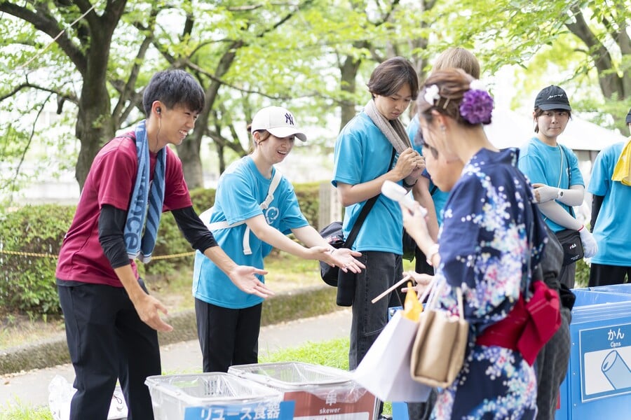 エコステーションでの分別回収の徹底、リユース食器の露店への導入、会場内での拾い歩きを通して、ごみのない天神祭を目指します。