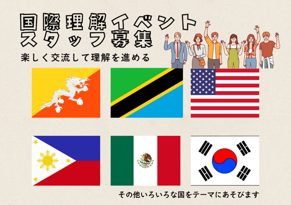 地域活性のイベントの中で国際理解のブースを出します。世界10各国の国をテーマにゲームや工作などをして、地域の方と交流します。その補助をお願いいたします!