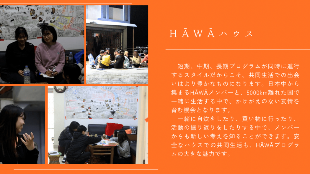 短期、中期、長期プログラムが同時に進行するスタイルだからこそ、共同生活での出会いはより豊かなものになります。日本中から集まるHĀWĀメンバーと、5000km離れた国で一緒に生活する中で、かけがえのない友情を育む機会となります。
