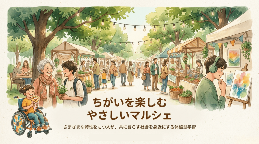 年齢や障がい、立場のちがいをこえて出会い、同じ空間でひとときを過ごす「ちがいを楽しむ やさしいマルシェ」。一人ひとりが主役として関わるあたたかな場を、みんなでつくります。