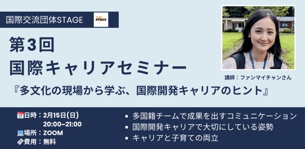 二つ目は、人とのつながりです。国際機関や様々な民間団体や政府機関、そして国際協力をしているNPO法人等に勤務されている多様な社会人アドバイザーがおり、様々な業界のプロフェッショナルの方々にサポートをしていただけます。なお、現メンバーは、日本全国に留まらずベトナム、カナダ、西アフリカ等の海外からも参加しています!STAGEは国際交流がしたい、自身を成長させたいという全国各地・世界各地の皆様の応募をお待ちしてます!