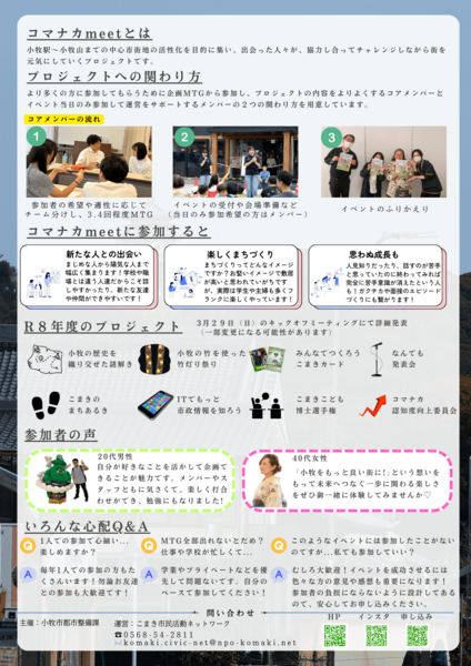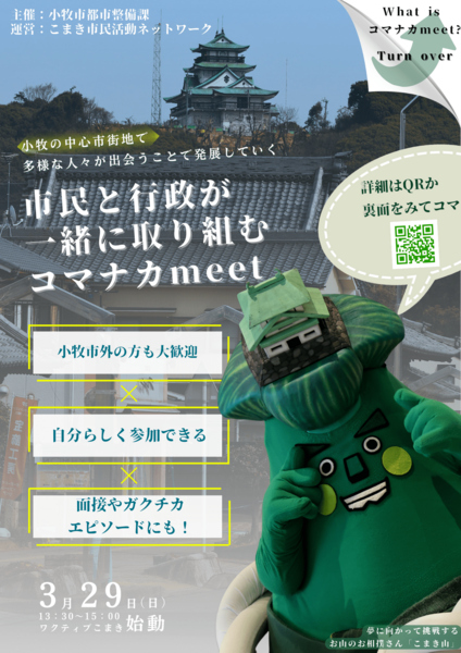 小牧駅から小牧山までの中心市街地の活性化を目的に集い、出会った人々が、協力し合ってチャレンジしながら街を元気にしていく社会実験です!3月29日(日)説明会あります!