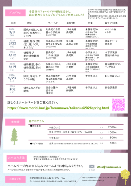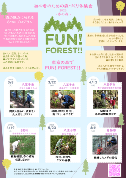 イベントの詳細は、森づくりフォーラムHP、初心者のための森づくり体験会 2026 ~春の森~をご覧ください。