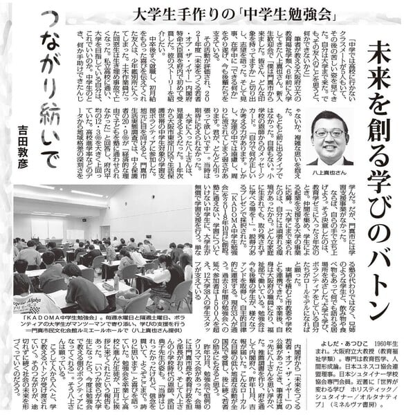 2018年10月門真市出身の大学生らが手弁当でスタート。全16大学27名の大学生が参加、大学生有志らが運営・企画をする市内中学生を対象にした居場所・学習支援です。2026年度大学生ボランティア募集!!