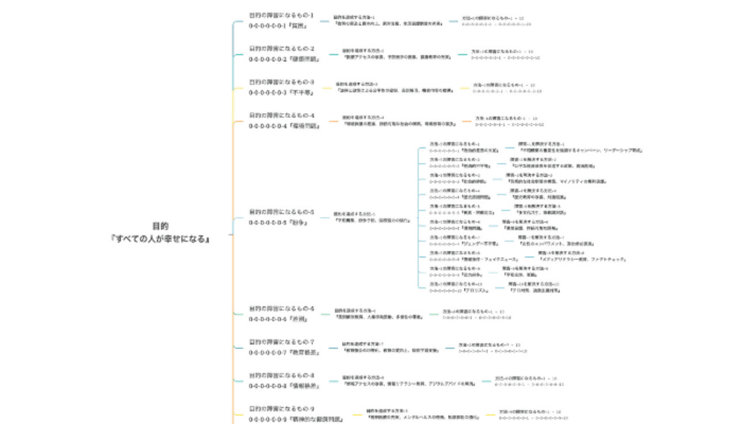 たとえば最初の目的を「すべての人が幸せになる」とすると、最初の障害として