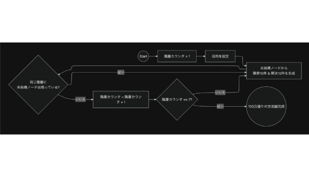 これは、1つの目的に対して障害を10件、その解決策を10件出し、それを階層的に広げていくことで、最大100万通りの方法論を構想する仕組みです。