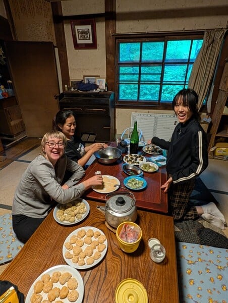 学舎の藁ぶきの建物(生きた文化財!)。男女別の相部屋。台所(囲炉裏も使える!)・風呂・洗濯機等の基本設備完備。交代で学舎の方々と自炊。