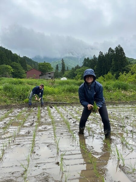共働学舎のメンバー達と有機農業(主に田植え、野菜の苗の植え付け。動物の世話も)!