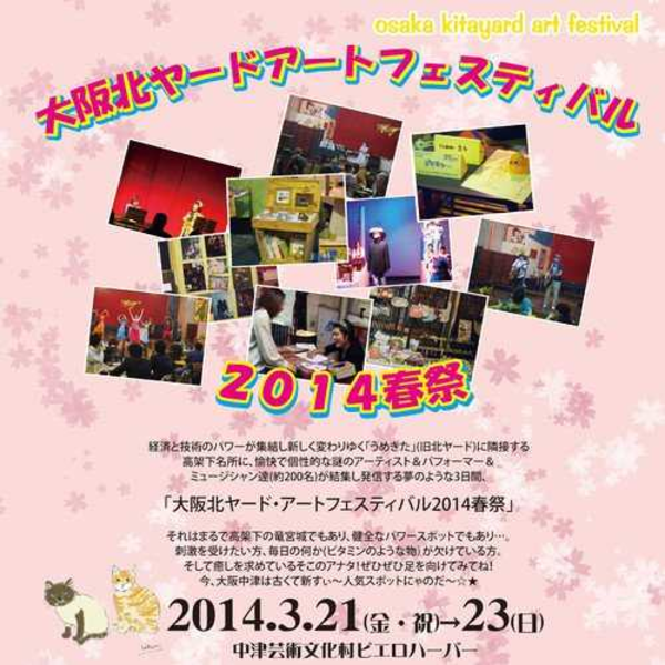 「大阪北ヤード・アートフェスティバル」とは…大阪北ヤードを盛り上げたい!という趣旨のもと、有志メンバーで実行委員会を結成し、2010年春祭に第一回目を開催。現在では平均約5000人の人が足を運ぶフェスティバルに成長。(入場無料)様々な芸術活動を一挙に集め、ジャンルの垣根を越えた形でお客様に楽しんでいただくと同時に、アーティスト同士の交流も図る「コラボレーション・イベント」である。●ボランティア内容●現在、スタッフが不足しています。。。そこで、このイベントをお手伝いしてくれる方を大募集中!!!アーティスト・パフォーマー・ダンサー・芸術家など総勢200名の参加者がいます。アートな空間でいろんな方たちと交流しながら、三連休を刺激的に過ごしませんか!?イベント好き、ボランティア活動好きな方、その他興味ある方はお気軽にお問合せください♪ステージでの音響、若干力仕事もありますので、男性大歓迎です!!※数時間でも大歓迎です!!【・前日の準備 ・誘導 ・ステージ(司会、音響、セッティングなど) ・インフォメーション、出演者受付 ・写真等の記録 などなど…】<無償・交通費なし>