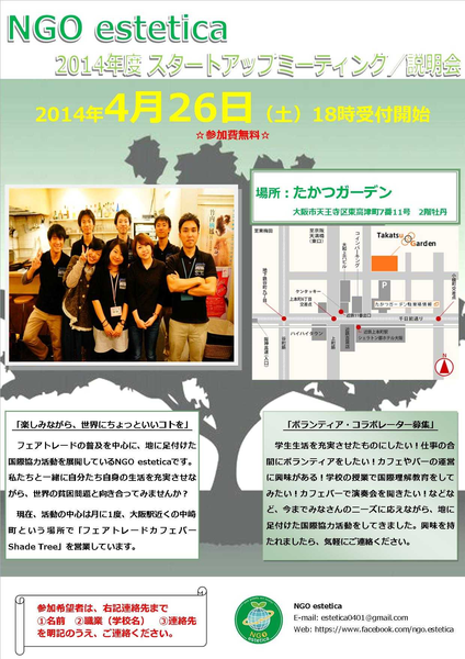 「楽しみながら、世界にちょっといいコトを」フェアトレードの普及を中心に、地に足付けた国際協力活動を展開しているNGO esteticaです。私たちと一緒に自分たち自身の生活を充実させながら、世界の貧困問題と向き合ってみませんか?現在、活動の中心は月に1度、大阪駅近くの中崎町と言う場所で「フェアトレードカフェ&バー Shade Tree」を営業しています。学生生活を充実させたものにしたい!仕事の合間にボランティアをしたい!カフェやバーの運営に興味がある!学校の授業で国際理解教育をしてみたい!カフェバーで演奏会を開きたい!などなど、今までみなさんのニーズに応えながら、地に足付けた国際協力活動をしてきました。当日は、18時受付開始となっており、1時間半程度の時間を予定しています(その後懇親会予定ですので、そちらもよろしければどうぞ☆)。これまでの活動報告、そして参加者の「やってみたいこと」「チャレンジしたいこと」「得意なこと」を全体で共有しながら、2014年度の活動を一緒に考えていきたいと思っています。興味を持たれましたら、お気軽にご連絡ください。