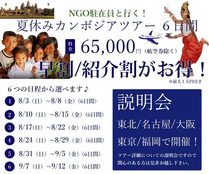 私共(財)カンボジア地雷撤去キャンペーンは、地雷問題とそれに関わる貧困解決や教育支援などを現地で実践するNGOです。現地に根差した活動を始めて今年で17年目になります。昨年の夏休みに大好評だったツアーが今年は行程内容特典さらにパワーアップ!日程も増え、6本の中からお選び頂けます。ツアー中は、カンボジアでの長い滞在経験を持つ日本人駐在員と日本語が得意なカンボジア人ガイドが同行しますので安心です。ツアーに興味を持ったらまずツアー説明会にお越し下さい。(※要事前申し込み)ツアー訪問地の説明や過去ツアー参加者の体験談などもあります!皆様のご応募心よりお待ちしております。
