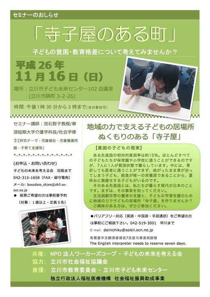 セミナー開催にあたり、会場準備、参加者へ会場案内、受付、資料配布、片付け等のお手伝いをお願いいたします。明るく、集合時間等を守れる方を希望します。 |