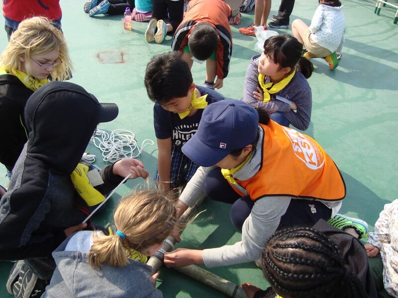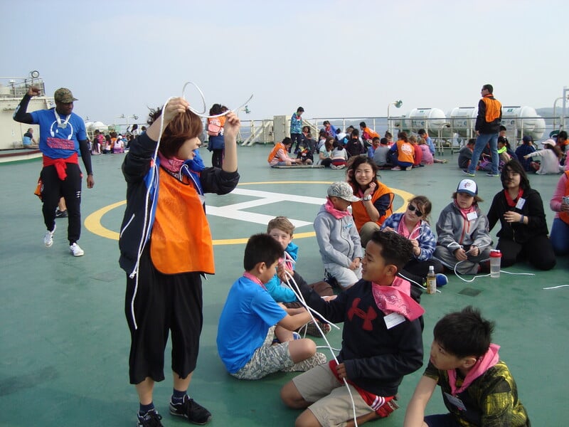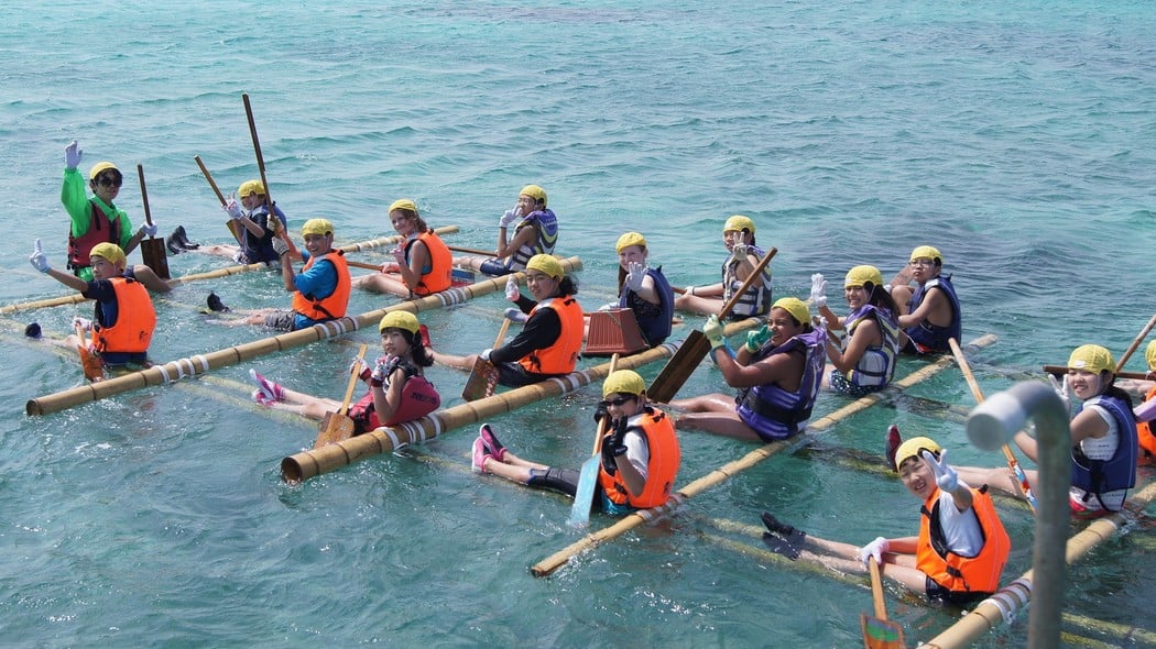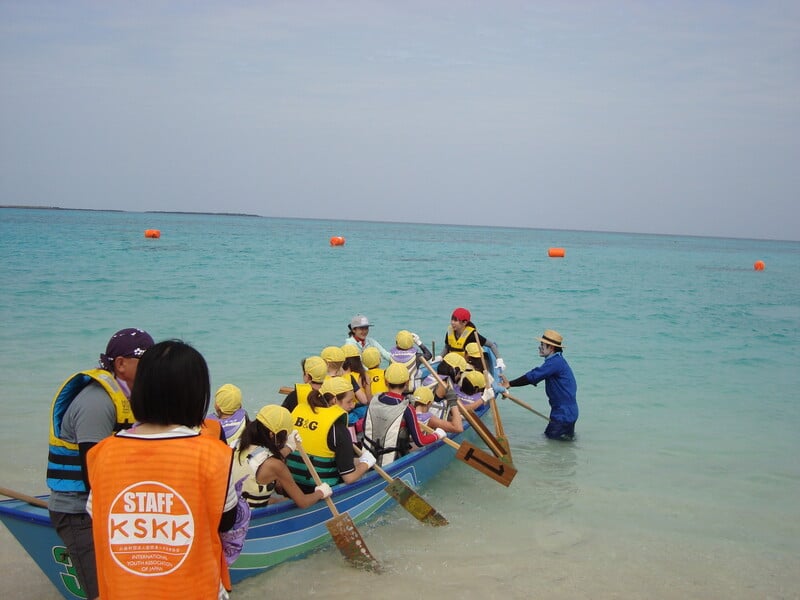 この事業は、全国から参加する小学2~6年生の日本人小学生約130人と在日外国人小学生約60人が、鹿児島県の一番南の島「与論島」で6泊7日の共同生活をしながら、海や島内で思いっきり野外活動や国際交流を体験します。民宿に宿泊しながら、自分達でイカダを作り、世界でも有数のエメラルドグリーンの海へ漕ぎ出したり、海の運動会をしたり、島内ハイクで鍾乳洞探険をしたり、さとうきびをしぼったりして、島の自然や風土、文化を感じながらたらしい友達と友情を深める事業です。活動を通じて、仲間と助け合う楽しさ、大切さを学び、言語・習慣を越えて友情を深める事を目的とし、毎年素晴らしい交流が育くまれています。多くのボランティアの方にご協力いただき、素晴らしい交流を作り上げています。子どもと遊ぶのが好きな人も、国際交流をしてみたい人も、学校の先生になりたい人も、一緒に南の島で体験しましょう!経験がない方も大歓迎です。必要な技術は養成講座を通して学ぶ事ができます。
