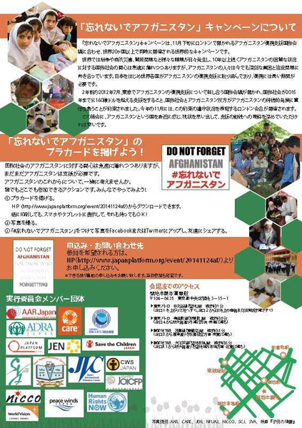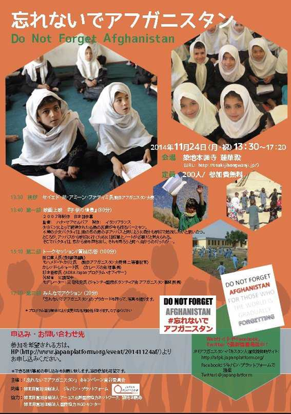 日時: 2014年11月24日(月・祝) 13:30~17:20会場: 築地本願寺 蓮華殿( )定員: 200人(参加費無料)主催: 「忘れないでアフガニスタン」キャンペーン実行委員会共催: 特定非営利活動法人ジャパン・プラットフォーム ■ プログラム13:30 挨拶 セイエド・M・アミーン・ファティミ氏(駐日アフガニスタン大使)13:40 第一部 映画上映『子供の情景』15:10 第二部 トークセッションスピーカー: 阪口直人氏(衆議院議員)、モハメド・ヤーセル・カリミ氏(駐日アフガニスタン大使館)、レシャード・カレッド氏(カレーズの会)、 杉本亜季氏(ADRA Japan)、外務省(調整中)司会:三宅隆史氏(シャンティ国際ボランティア会)17:00 第三部 みんなでアクション 参加者で写真撮影