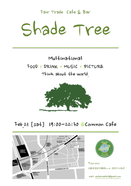 ☆フェアトレードカフェ&バー Shade Tree 運営(月1回営業)☆フェアトレードフットサルボールを使用した、フットサルイベントの開催☆海外のことを知ることのできるセミナーの開催