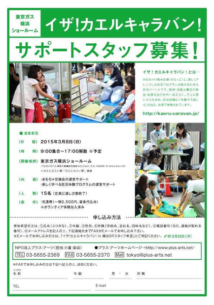 ※募集定員に達したため、募集を締め切らせていただきます。ご応募いただいた方、ありがとうございます。詳細連絡は別途ご連絡差し上げます。横浜にあるショッピングモール、MARK IS みなとみらいにて、「イザ!カエルキャラバン!」を開催いたします!☆イザ!カエルキャラバン!とは☆おもちゃの物々交換(かえっこ)と、楽しくアレンジした防災プログラムを組み合わせた防災イベントです。阪神・淡路大震災の教訓・知恵を次の世代へ伝えたい。そんな想いから生まれ、防災訓練に「体験する楽しさ」を加え、全国で開催されています。※さらにくわしくは→今回、このカエルキャラバンを当日サポートしていただくスタッフを募集いたします!おもちゃ交換の「かえっこバザール」のサポートや、防災体験プログラムの運営サポートをお願いします。楽しく学べる防災訓練に興味のある方、子どもや教育に興味のある方、ボランティアは初めてという方、歓迎です。子どもたちと一緒に楽しく防災知識を身に付けましょう!みなさまのご応募、心よりお待ちしております。