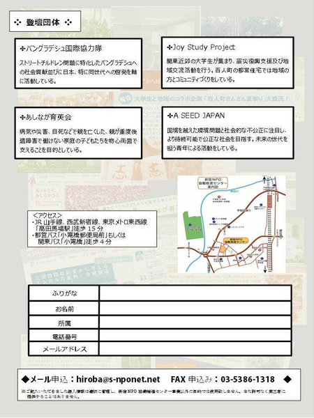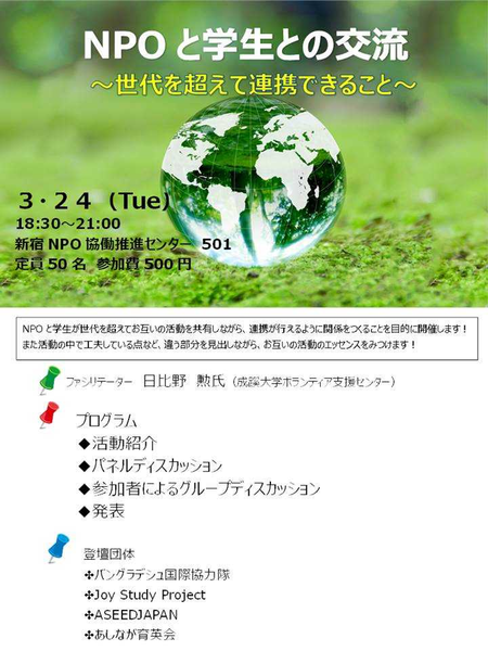 NPOと学生が世代を超えてお互いの活動を共有しながら、連携が行えるように関係をつくることを目的に開催します! また活動の中で工夫している点など、違う部分を見出しながら、お互いの活動のエッセンスをみつけます!●日時2015年3月24日(火)18時30分~21時●場所新宿NPO協働推進センター 5階501会議室(東京都新宿区高田馬場4-36-12)●交通アクセスJR高田馬場駅 早稲田口から徒歩15分都営バス 小滝橋車庫行き「高田馬場4丁目」下車 徒歩4分●全体進行日比野 勲氏(成蹊大学ボランティア支援センター)●パネリストバングラデシュ国際協力隊(学生団体)Joy Study Project(学生団体)A SEED JAPAN (NPO)あしなが育英会●対象新宿区内で活動している社会貢献活動団体、または社会貢献活動に関心のある方、 学生団体に所属している方、もしくはこれから活動してみようと考えている学生の方●定員50名●参加費500円●申し込み方法、条件お電話もしくはメールでお願いします。その際、必ずお名前(ふりがな)、所属団体(あれば)、 メールアドレス、当日連絡先をお伝えください。(メールの場合、件名に「NPOと学生との交流 参加申込」とご記入ください。)《連絡先》●主催・問い合わせ先新宿NPO協働推進センターTEL:03-5386-1315(9時~21時 休館日:第二火曜日)Mail:[email protected] (担当:西郷・島)