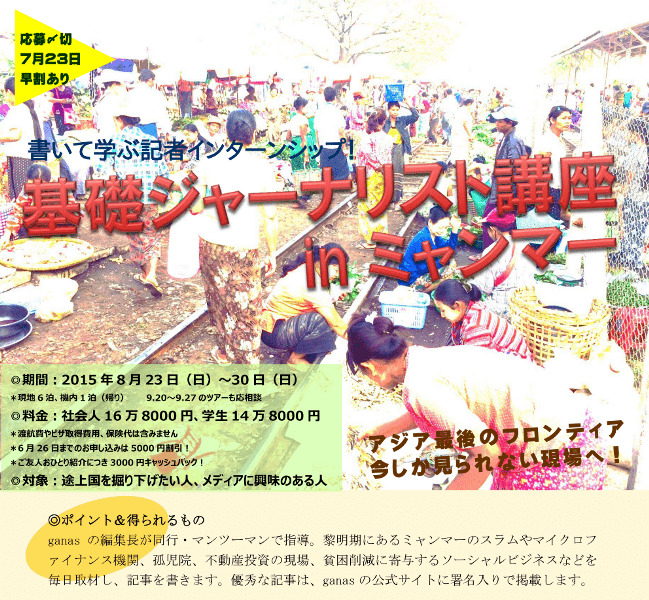 開発メディアganasが主催する記者インターンシップ「基礎ジャーナリスト講座」の第2回説明会を開きます。基礎ジャーナリスト講座は今回が4回目(セブ2回、ハノイ1回)。この夏は、フィリピン・セブ、ベトナム・ホーチミン、ミャンマー・ヤンゴンの3つの行き先をご用意しました。記者志望の方も、そうでない方も参加可能です。■日時5月26日(火)午後7時15分~8時45分■会場JICA地球ひろば セミナールーム201AB■概要説明会では、基礎ジャーナリスト講座で実際にどんなことをやり、何が学べるのかをご説明します。とりわけ重視する「視点のもち方」について、こういうふうに途上国をとらえるとおもしろいといったお話もさせていただきます。同時開催する「ミャンマーの今」ミニ講演会では、ヤンゴンでソーシャルビジネスに挑戦中の起業家が、熱いミャンマーを熱く語ります。■お申し込み方法FBのイベントページ()の右上にあるボタン「参加する」を押していただくか、メール([email protected])でご連絡ください。■参加費無料■定員50人(先着順)■基礎ジャーナリスト講座の詳細(早割がお得です!)・セブ・ホーチミン・ミャンマー■説明会の今後の日程・第3回 6月6日(土)午後6時15分~7時45分・第4回 6月25日(木)午後7時15分~8時45分