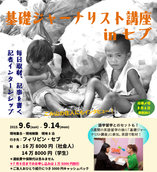 記者インターンシップ「基礎ジャーナリスト講座 in セブ」を主催するのは、途上国・国際協力に特化したNPOメディア「開発メディアganas」(運営は特定非営利活動法人開発メディア)です。同行する編集長の指導を受けながら、参加者自身が直接、現地のいろんな人にインタビューし、記事を書くという内容になっています。観光なしとハードですが、自身の行動力、洞察力(視点のもち方)、文章力などをアップさせる絶好のチャンスです。基礎ジャーナリスト講座の開催は今回が4回目。これまでにフィリピン・セブで2回、ベトナム・ハノイで1回実施してきました。取材の自由度の高さ、英語が通じやすい状況などを総合的にみると、セブが一番お勧めです。■基礎ジャーナリスト講座の“5つのポイント”1)毎日が取材・執筆取材先までは参加者全員で移動し、着いたら個人で自由に取材します。取材は、現地の事情を深く知る手段。卒論のフィールドワークや企業のリサーチにも活用できます。ホテルに戻ってからは各自で記事を書きます。2)取材先は多種多様取材先は、貧困層に職業訓練を提供する会社、孤児院、2000ドン(11円)食堂、宝くじ売りの家などいろいろ。参加者の興味にあわせて決めていきます。さまざまな場所を取材するので、いろんな角度から途上国を見られます。取材では英語も使います。3)記事は署名入りで掲載リライトを重ね、記事の質を高めていきます。優秀な記事はganasの公式ページに署名入りで掲載。数千人の読者に届きます。4)マンツーマンで指導ganas編集長が同行し、視点のもち方はもちろん、ねた探しからインタビューの仕方、データの取り方、文の組み立て方までを1対1でお教えします。記者の基本的なスキルはもちろん、伝わる文章の書き方も学べます。このノウハウはエントリーシートの作成にも役立ちます。5)コミュニケーション力が向上取材の基本は、物事を深掘りする質問力。質問力は、記者としてだけでなく、どんな仕事にも活用できます。■詳細◎行き先:フィリピン・セブ◎期間:2015年9月6日(日)~14日(月)(現地8泊)*現地集合(空港でのお迎えあり)・現地解散◎料金:社会人16万8000円、学生14万8000円*渡航費や保険代は含みません*含まれるもの:宿泊費、食費、現地での移動費、講習費◎〆切:2015年8月6日(木)*7月6日(月)までのお申し込み(入金完了)は1万5000円割引!*ご友人おひとりご紹介につき3000円キャッシュバック!◎定員:8人(先着順)◎事前研修:8月末~9月初めを予定*参加者の都合を優先し、日時を決める予定です◎主催:特定非営利活動法人開発メディア(ganasの運営団体)◎お問い合わせ先:[email protected]◎説明資料:◎ムービー:(2014年夏「基礎ジャーナリスト講座 in セブ」)■無料説明会(東京・JICA地球ひろば)~お気軽にご参加下さい!~5月15日(金)19:00*月26日(火)19:15*月6日(土)18:15*月25日(木)19:15月(未定)*の回は「ミャンマーの今」ミニ講演会付き■英語留学とのセット料金もお得!フィリピン・セブといえば英語留学のメッカ。英語留学と「基礎ジャーナリスト講座 in セブ」の組み合わせはいかがでしょう? 割引額も大きくお得。学んだ英語を生かして取材にチャレンジ!たとえば・3週間の留学の後に「基礎ジャーナリスト講座」に参加→29万4000円・4週間の留学の後に「基礎ジャーナリスト講座」に参加→32万円*渡航費や保険代、教科書代、特別学生ビザ代は含みません*含まれるもの:基礎ジャーナリスト講座の講習費、ホテル⇔取材先の移動費、宿泊費・寮費、食費、英語学校の入学金・授業料、留学時の洗たく代*学生のみ対象*ご友人ご紹介につき、紹介者と申込者双方に5000円キャッシュバック