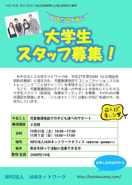 NPO法人JAMネットワークは、平成27年度WAM(社会福祉振興助成事業)に選定され、児童養護施設でコミュニケーションスキルトレーニング「ことばキャンプ」を実施することになりました。