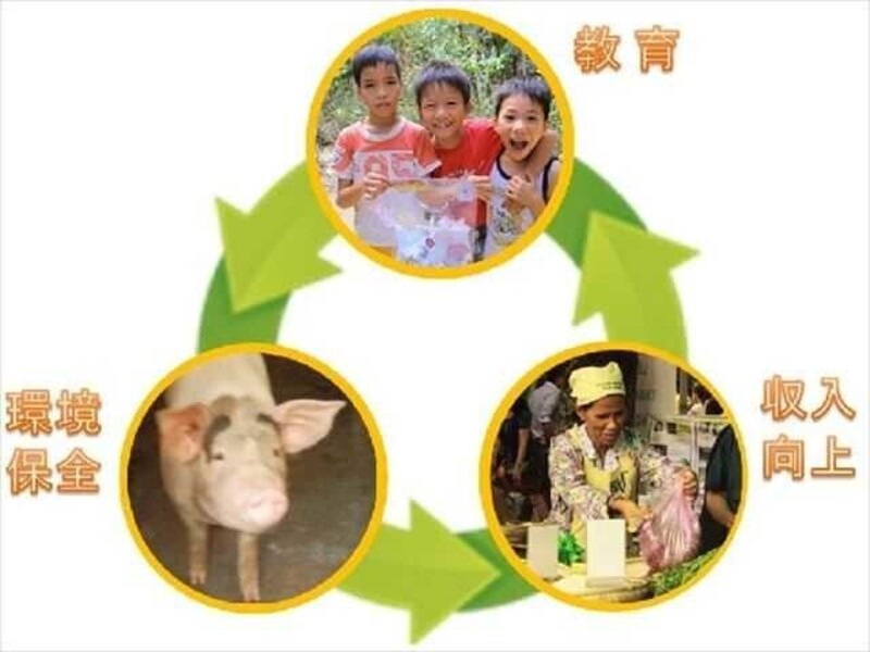 BAJはベトナム中部フエ市にて、所得の低い養豚農家の収入向上プロジェクトを展開しています。当事業では、豚の糞尿を利用してバイオガスと肥料を生成する設備を設置し、燃料費と肥料代を削減することに加え、農畜産物直売所を運営しています。野菜、豚肉、鶏卵などの生鮮食品や生姜の砂糖漬け・プリンといった加工品を販売、イートインスペースもあります。