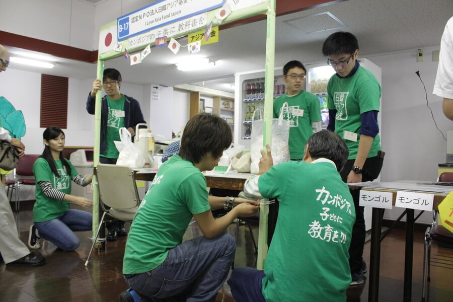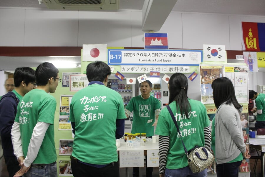 今回私たち日韓アジア基金のボランティアスタッフは、("日韓の若者がアジアの恵まれない子供達の為に協働する"という目的のため)カンボジアの子供たちに教科書を届けるべく、秋祭りに訪れるお客様に韓国茶を無料で提供すると共に、教科書の募金活動や当会の宣伝活動を行いました。