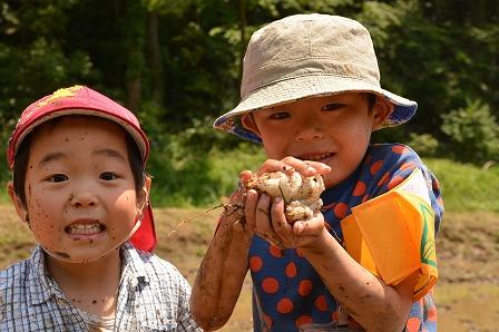 写真は田植えの際にシュレーゲルアオガエルの卵を救出している様子