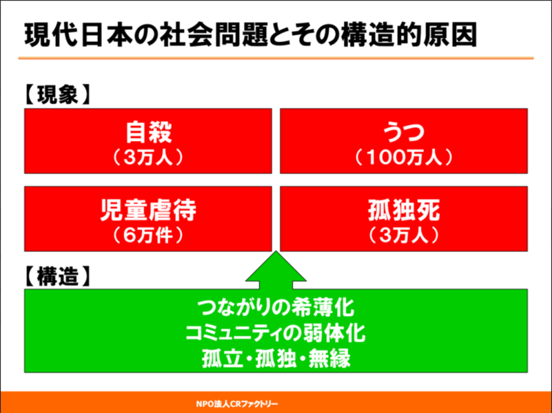 「つながり」や「居場所」が減少していることが、「根本的な原因」であると私たちは考えています。