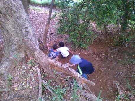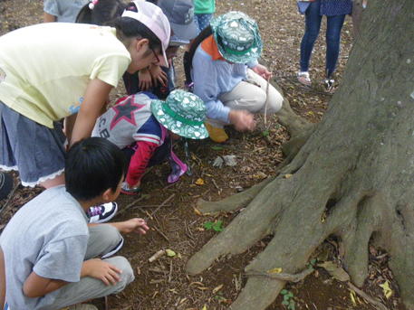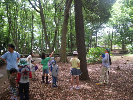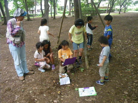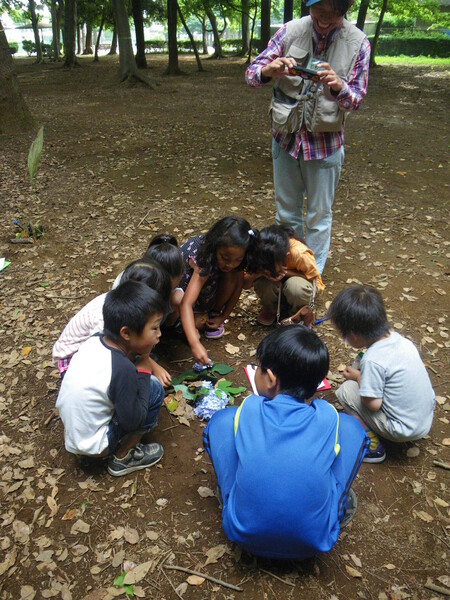 森の探偵団 ◆月1回、短縮授業の日に、プロの「自然翻訳家」を呼んで、習志野市の香澄公園の森まで遠征してネイチャーゲームなどして遊んでいます。
