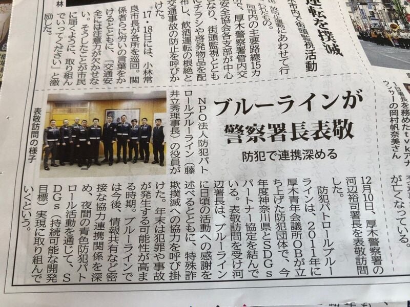 神奈川県厚木警察署管内で夜間防犯パトロールを行う 自主防犯団体ブルーラインは、厚木青年会議所のOBを中心に立ち上げたボランティア団体です。日本財団チーム青パトと協賛企業50社で購入した防犯カメラを車載した青色回転灯装備車両(パトカー)と青パト登録した13台の自家用車で、神奈川県警察本部や行政の不審者情報を参考に青少年の薬物防止と女性やお年寄りの守り活動を行い特殊詐欺への防犯意識の向上に寄与するとともに、地域団体の防犯支援を行っております。活動地域は厚木警察署管内全域(厚木市・愛川町・清川村)です。