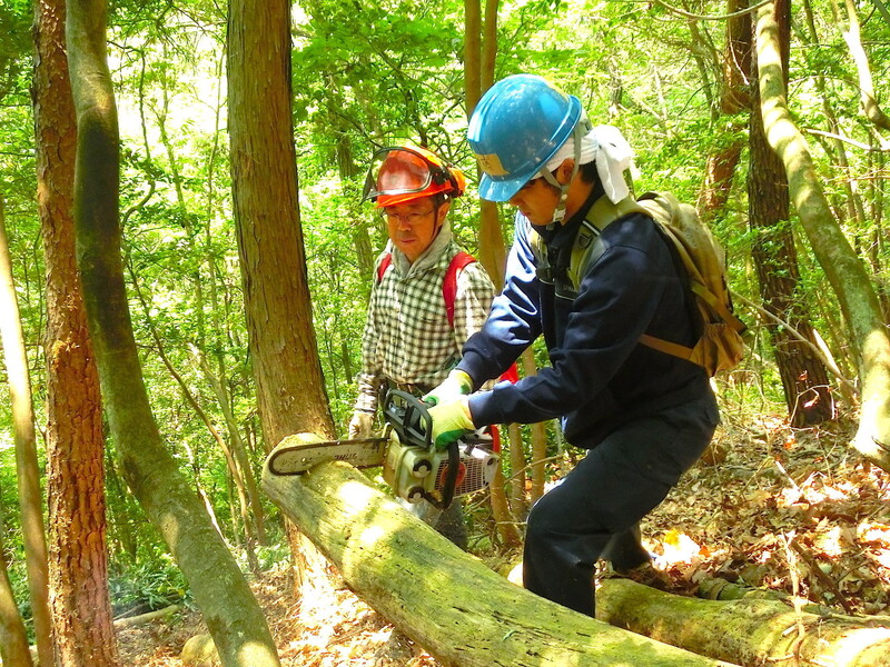 での遊歩道(階段)の作成、間伐で木を切り倒すことまで体験