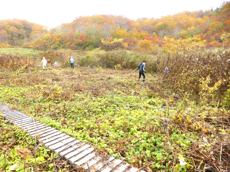 草刈り体験をしていた慶応大学の学生さんたちやOBの方々と