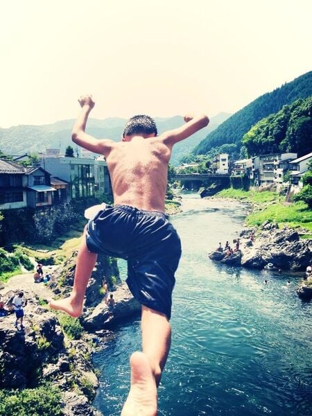 郡上の子どもには昔から自然の中で遊び、高さ12mの橋から川へ飛び込む文化が今も息づいています。