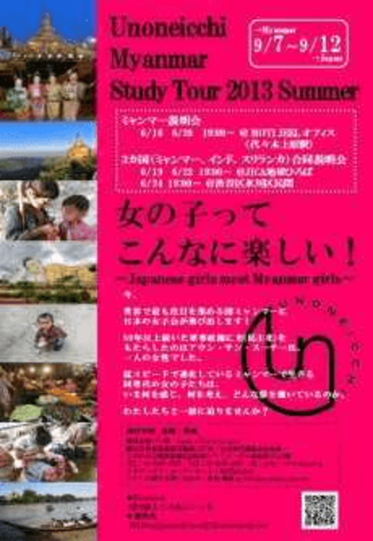 【うのあんいっち2013ミャンマースタディツアー企画】世界へ飛び出せ!日本の女子会♡『女の子ってこんなに楽しい!~Japanese girls meet Myanmar girls~』日程>>9月7日(土)~9月12日(木)(4泊6日)対象>>女子学生 <ミャンマー説明会>【日時】6月28日(金)19:00~20:30 @MOTI JEEL(代々木上原駅徒歩5分)<3カ国合同説明会(他インド、スリランカ)>6月19日(水)19:00~20:30 @JICA地球広場(市ヶ谷駅徒歩8分)6月23日(日)19:00~20:30 @JICA地球広場(市ヶ谷駅徒歩8分)6月24日(月)19:00~20:30 @氷川区民会館(渋谷駅徒歩10分)▼説明会参加申し込みはコチラーーーーーーーーーーーーーーーーーーーーーーーーーーーーーーーーーーーーーーーーーーーーーーこの夏!うのあんいっち史上初のミャンマーで、前代未聞の『女子会@ミャンマー』をやります!!! 1.そもそもスタディツアーとはなんだろう?と思ったそこのアナタ!さぁここで、40秒でわかる説明をしましょう!まず、スタディツアーというと、発展途上国でボランティア活動をしたり現地の人と交流することを思い浮かべるのではないでしょうか?また、スタディということで、その国の歴史や文化、政治等について学ぶのかなと思いませんか?たしかに、それもやります。でも、ちょっとだけ自分たちのポジションが違うのがスタディツアーです。そう、スタディツアーの最大の魅力は、その国を外側からではなく内側から体感できること。そこにあると考えます。例えば、海外ボランティアは、『助けが必要なんだ!自分が救ってあげたいんだ!』というよりも、ただその国がどういう現実に直面しているのか知りたいがための、ボランティアというかっこいい響きをまとった好奇心になっていませんか? もちろん、その国の現実を自分の目で見る事はとても大切なことですし、実際に行動をとることだけでも十分に素晴らしいことだと思います。だけど、どうせ高いお金を払って海外に行くのなら、一方的に外側からその国を見つめて吸収するだけではなく、自分からアプローチしてその国の人たちにも何か感じてもらう、つまり内側から発信してより深くその国のことを体感したくありませんか?ツアー会社では決してこのようなことはできません。学生だからこそ、普通はできない自分たちのやりたいことを実現できるのです。ツアー会社と違ってたった一度しか実行されない企画。たった一度きり、そして世界に一つだけの企画、だからこそ最高のものになるのがスタディツアーです。 ===================================== まず、あなたに質問です。“あなたが“女の子でよかった”と思う瞬間はどんなときですか?お洒落をして出かけるとき?友達とおしゃべりをしているとき?甘いケーキや美味しいごはんをたべているとき?誰かに恋をしているとき?改めて聞かれると、『あ~、たしかに』と思いませんか?日本の女の子はいまや男の子にも負けないくらいパワフルに生きていますが、ワークライフバランスの問題など女性が行きにくい現状がまだまだあります。そこで、今回は女の子でよかったことを再認識すると共に、これから先自分がどうありたいのか、見つめて行くキッカケとなることを目的としたツアーを考えました。 その行き先としてビビッと来たのが・・・いま世界で最も注目を集めている、黄金の国ミャンマー!!!50年以上に及んだ軍事政権に光(民主化)をもたらしたのはなんと、ひとりの女性。ご存知アウン・サン・スーチー氏です。彼女を生んだミャンマーとは一体どんな国なのか、知りたくありませんか?知りたいですよね?(笑) 実は、ミャンマーは軍事政権が終わってもなおアジア最貧国、仏教徒の国であり女人禁制といった女性差別という深刻な問題を抱えています。その一方で女性の就学率は高く、これから先ますます女性が社会進出することも予想されます。 そんなミャンマーが今まさに輝きを取り戻すべく、目まぐるしい進化を遂げているわけですが、その中で生きる同世代の女の子たちと日本で生きている私たちが『いま何を感じ、何を考え、どんな夢を描いているのか?』をテーマに女子会をします♡ -----------▼日程概要---------------------------------------------【期間】2013年9月7日(土)~12日(木)4泊6日【対象者】女子学生(専門学校生、院生可)【参加人数】15名程度【スケジュール予定】9月7日 日本出発 ヤンゴン着 ホテルへ 8日 ヤンゴン現地企業訪問、日本語を学ぶ学生との交流 9日 空路バガンへ ニャンウーマーケット、シュエズィゴンパゴダ、アーナンダー寺院、 ティーローミィンロー寺院、タビィニュ寺院、マヌーハ&ナパヤ寺院、 漆工場見学後、ダマヤンヂー寺院、ナンダミニャ寺院、 シュエサンドーパゴダより夕日観賞 10日 午前:ヘイホーへ 陸路にてホーインレー湖へ 着後、小舟に乗ってインレー湖観光(ファンドーウパゴダ。インダー族の浮島な ど)、シルク工房見学 、首長族見学 11日 空路ヤンゴンへ ヤンゴン市内観光 (シュエダゴンパゴダ、チャウタージパゴダ) 孤児院訪問、ヤンゴンアウンサンマーケットなど 空港へお見