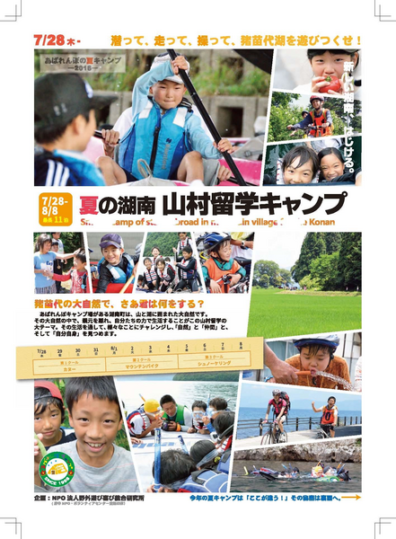 湖水浴、カヌー、シュノーケリング、マウンテンバイク、登山などのアクティビティ、畑や田んぼの農業体験などのプログラムを実施します