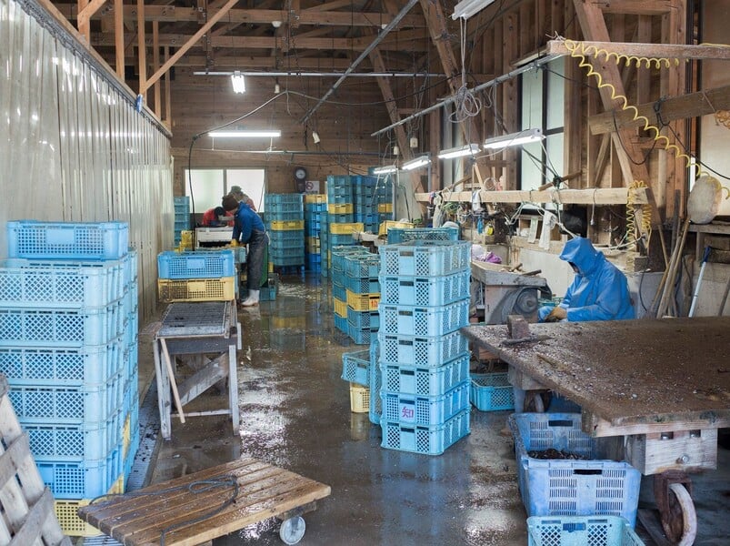 1:水産加工の現場での作業(岩がきの養殖場、ナマコ加工場、イカ凍結センター)