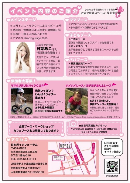 ママHOLIDAYフェスタでは、ママが子供から肌を離して普段出来ないことをやったり、聞いたり購入したりゆっくり過ごしてもらうのが目的です。