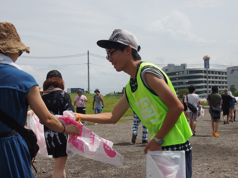 サマソニ特製のごみ袋を、会場の環境対策やメッセージを伝えながら、来場者一人ひとりに配布します。